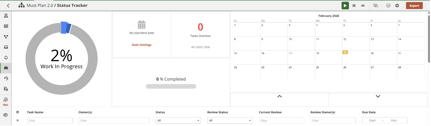 The dashboard provides a structured view of your planning workflow. It includes a work-in-progress donut chart (for example showing 2% in progress), completion bars, and a calendar view for upcoming deadlines.
